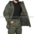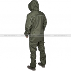 Мужской костюм для ношения в прохладные дни летом или в межсезонье. Костюм состоит из куртки и брюк, сшитых из особой ткани – легкой и износоустойчивой гидрофильной мембраны производства компании Меркурий: она защищает от ветра и небольшого дождя, при этом хорошо отводит пар, создавая комфортный микроклимат внутри. Сетчатая подкладка также способствует дополнительной вентиляции.