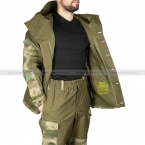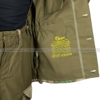Куртка костюма застегивается на пуговицы, верх переходит в несъемный капюшон. На талии, рукавах и манжетах вшиты резинки для защиты от задувания ветра. Внутри есть карман для документов.