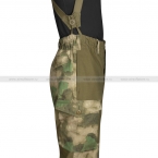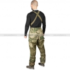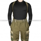 Брюки, аналогично куртке, застегиваются на пуговицы. В зоне пояса есть шлевки для ношения поясного ремня, кроме того брюки комплектуются подтяжками. Крой брюк – свободный, в зоне позади колен вшиты сборки на резинке для защиты от вытягивания. Низ штанин также на резинке.