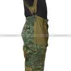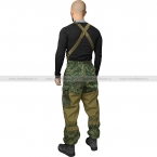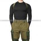 Брюки прямого кроя, очень удобные, не стесняют движений при беге, приседаниях, когда вы поднимаете ногу и т.д. Брюки застегиваются на пуговицы, имеют шлевки для ношения поясного ремня шириной до 5 см. Пояс и низ брюк снабжены вшитыми резинками для посадки по фигуре. В области коленного сустава, сзади, также имеется сборка на резинке, которая препятствует вытягиванию брюк в этой зоне. У брюк есть 2 прорезных кармана по бокам, 2 вместительных кармана на пуговицах в области бедра и 2 кармана сзади.