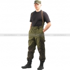 Брюки застегиваются на пуговицу, есть шлевки для поясного ремня. Альтернативой поясному ремню выступают съемные подтяжки, идущие в комплекте. Пояс брюк и низ штанин на резинке. Особый крой деталей в области коленного сустава препятствует вытягиванию брюк. 6 карманов: 2 по бокам, 2 на бедрах, 2 задних.