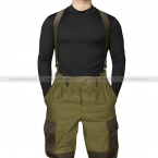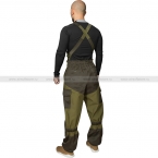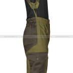 Брюки – свободные и удобные. На талии имеют вшитую резинку, за счет чего хорошо обегают пояс и не давят. Низ каждой из штанин также оснащен резинками. Брюки застегиваются на пуговицу, гульфик (ширинка) также на пуговицах. Специфика кроя брюк в области колен препятствует их вытягиванию в процессе ношения, задние половинки под коленом собраны резинкой. 6 карманов: 2 боковых, 2 задних, 2 на бедрах. Комплектуются подтяжками.