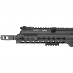 Облегченное цевье имеет интерфейс KeyMod. 20 мм планка также идет по всей длине верхней части ресивера и цевья, что дает возможность закрепить на автомате необходимое навесное оборудование (рукоять, фонарь, коллиматорный прицел и т.д.).