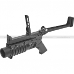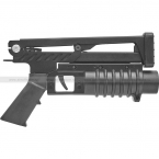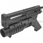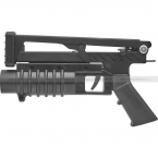 Внешний корпус гранатомета изготовлен из литого пластика, ствол – из алюминиевого сплава Д16Т. При необходимости гранатомет можно снять с платформы и установить на модель страйкбольного оружия с RIS-планкой на нижней грани цевья.