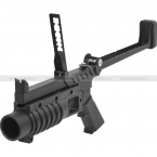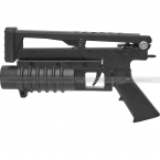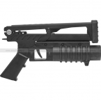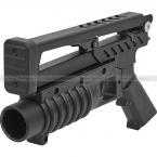 Внешний корпус гранатомета изготовлен из литого пластика, ствол – из алюминиевого сплава Д16Т. При необходимости гранатомет можно снять с платформы и установить на модель страйкбольного оружия с RIS-планкой на нижней грани цевья.