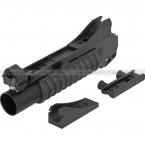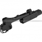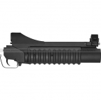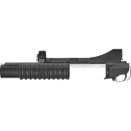 Укороченная версия 40 мм страйкбольного гранатомета М203 от King Arms. Гранатомет устанавливается в нижней части цевья либо при помощи 20 мм крепления (RIS), либо при помощи креплений на внешний ствол (оба типа креплений идут в комплекте). Корпус гранатомета изготовлен из алюминиевого сплава, крепежные винты и пины – стальные, накладка – пластиковая. Изделие совместимо с пиротехникой от TAG Inn и СтрайкАрт, в редких случаях требуется самостоятельно доработать гильзу.