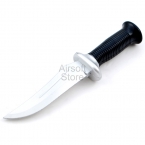 Тренировочный резиновый нож. Общая длина (рукоять + лезвие) составляет 27 см. Лезвие выполнено из резины, хромированного цвета. Рукоятка из плотной резины, с рельефом для противодействия скольжению.