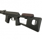 Страйкбольная версия снайперской винтовки Драгунова. Cyma CM057A в точности копирует боевой аналог по внешнему виду элементов. Очень высокое качество сборки и точности подгонки частей друг к другу. Металлический корпус и ствол, приклад и цевье выполнены из пластика.