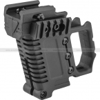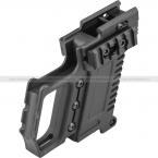 KIT для страйкбольных пистолетов GLOCK, модели G17, G18 и G19. КИТ закрепляется к RIS-планке пистолета, имеет отделение для размещения дополнительного магазина, а также "рельсы" для установки фонаря или ЛЦУ. КИТ выполнен из ударопрочного пластика и стальных стягивающих винтов.