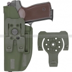 Корпус кобуры отлит из высокопрочного пластика точно по габаритам пистолета. Оружие надежно удерживается внутри специальным зажимом, при этом вставляется и вынимается из кобуры четким движением. Для извлечения необходимо нажать на тугую кнопку.
