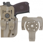 Кобура Альфа для пистолета Макарова. Изготовлена из высокопрочного пластика методом литья. За счет возможности крепления на MOLLE стропах и настройки угла поворота, кобуру можно разместить на снаряжении в наиболее удобном месте так, чтобы вооружение всегда было "под рукой". Пистолет надежно фиксируется внутри запирающим механизмом и извлекается только при нажатии на тугую кнопку.