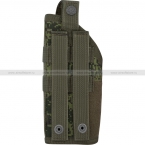 Универсальная кобура с креплением MOLLE. Кобура может быть настроена практически под любые модели пистолетов, включая модели с фонарями и ЛЦУ. Пистолет фиксируется в кобуре удерживающим ремешком на кнопке. Глубину посадки пистолета в кобуре возможно настроить за счет стропы на велкро-липучке.