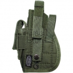 Универсальная поясная кобура под правую руку. Кобура подходит для большинства моделей пистолетов за счет настраиваемой конфигурации. На корпусе имеется подсумок для запасного пистолетного магазина.