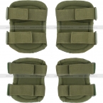 Комплект наколенников и налокотников для защиты коленных и локтевых суставов от ударов, царапин и травм в случае падений или ударов о твердые предметы. Каждый элемент конструкционно состоит из мягкой тканевой основы со слоем упругой пенки внутри и закрепленной сверху пластиковой защитной чашечки (в зависимости от партии чашечка может быть также из плотной резины).