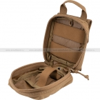 Подсумок закрывается на молнию, которая раскрывает его на манер чемодана: на две части, делая видимым всё содержимое. Медикаменты, бинты и другие необходимые предметы можно закрепить при помощи эластичных лент и в кармашке.