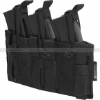 Тройной оружейный подсумок под магазины серии АК, M4/AR15 и схожих по габаритам. Магазины удерживаются внутри отделений эластичными резинками с "язычками". Подсумок крепится на MOLLE, занимая 6 ячеек в ширину.