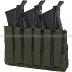 Надежный и практичный открытый подсумок для трёх стандартных магазинов серии АК, M4/AR15 или других схожих по размеру. Фиксация магазинов осуществляется эластичным жгутом с пуллером. Крепится подсумок на снаряжении с помощью системы MOLLE, занимая шесть ячеек по ширине.