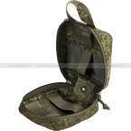 Подсумок оснащен двусторонней молнией, позволяющей полностью открыть его и увидеть содержимое. Внутри расположены эластичные ленты и карман, предназначенные для аккуратной укладки и фиксации перевязочного материала, шприцов, жгутов и других медикаментов.