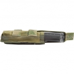 Открытый оружейный подсумок с креплением MOLLE. Предназначен для одного магазина серии АК и аналогичных по размеру. Магазин удерживается внутри отделения эластичным жгутом с пуллером. Крепление на снаряжении осуществляется за счет строп MOLLE на обратной стороне подсумка. С внешней стороны расположены ячейки МОЛЛЕ, за счет которых на подсумке можно крепить другие подсумки для масштабирования.