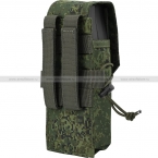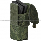 Оружейный подсумок закрытого типа вмещающий до 2х магазинов серии АК. Магазины плотно сидят внутри за счет опоясывающей подсумок резинки. Сверху подсумок закрывается на клапан с липучкой. Снизу имеется люверс для отвода попавшей воды.