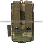Открытый подсумок для радиостанции малого и среднего размера. Надежное удержание рации внутри достигается, во первых, за счет широкой резинки, опоясывающей подсумок, во-вторых, на счет эластичного жгута с фастекс-застежкой в верхней части. Большим преимуществом подсумков открытого типа является то, что настройку каналов на большинстве моделей радиостанций можно осуществлять без извлечения из подсумка. На обратной стороне подсумка пришиты стропы MOLLE для крепления на снаряжении.