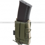 Оружейный подсумок для одного магазина серии АК, М4/AR15 или аналогичных по размерам моделей. Он сохраняет работоспособность при любых температурных условиях. Магазин надежно фиксируется внутри благодаря плотным тканевым стенкам и жесткой пластиковой рамке по бокам. Для объединения всей конструкции используется эластичный шнур, с помощью которого можно регулировать как объем отделения, так и степень плотности посадки магазина.