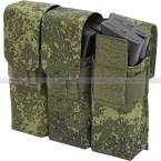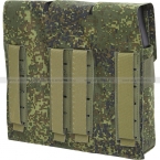 Тройной оружейный подсумок закрытого типа для размещения 6 магазинов серии АК. Каждое отделение снаружи опоясывает широкая резинка. А внутри имеется перегородка для устранения бряцающего звука, а также надежности удержания и чёткости извлечения магазинов.