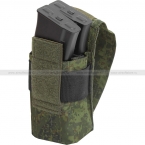 Прочный оружейный подсумок из износостойкого нейлона и с креплением MOLLE. Отделение подсумка спроектировано под два магазина АК-серии. Магазины разделяются съемной перегородкой. Снаружи корпус опоясывает широкая резинка. Закрывающий клапан на липучке.