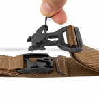 Пряжка изготовлена из полимерного, морозостойкого пластика. Фиксируется стальной пластиной с магнитной защелкой. При всей простоте конструкции и легкости расстегивания/застегивания, пряжку практически невозможно случайно (самопроизвольно) открыть, а на разрыв она выдерживает нагрузки до 70 кг. Комфортная длина ремня быстро и легко выставляется, надежно фиксируется пряжкой.