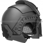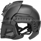 Защитный шлем для игры в страйкбол с практически максимальной площадью защиты головы. Когда опущено забрало шлем полностью закрывает лицо и всю голову. Специальная накладка, идущая в комплекте, дополнительно защищает зону за ушами и верхнюю часть шеи. Открытыми фактически остаются только уши. Это сделано намеренно, чтобы была возможность использования наушников. Если наушники не используются, то можно установить защитные накладки (в комплект не входят).