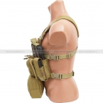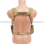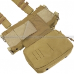 Снизу на велкро-липучке закреплен вместительный напашный подсумок, состоящий из двух отделений. На плечевых лямках есть ячейки MOLLE для крепления, например, ножа или ХИС. Лямки регулируются в широком диапазоне и могут быть быстро отстегнуты от жилета, т.к. крепятся к нему на фастексах. При помощи переходников (приобретаются отдельно) жилет можно закрепить к переднему клапану бронежилета.