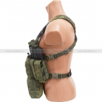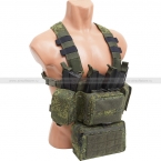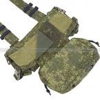 Нагрудный разгрузочный жилет с набором интегрированных подсумков различного назначения. Есть 4 оружейных подсумка открытого типа под магазины серии АК или M4/M16, 2 подсумка под пистолетные магазины, а также административный и универсальный подсумки. В нижней части на текстильной липучке закреплен вместительный напашный подсумок, который можно использовать для размещения аптечки, ИРП, инструментов, пачки шаров и т.д.