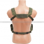 Корпус разгрузочного жилета сшит из плотного и износостойкого нейлона. Лямки регулируются в широком диапазоне, что позволяет их настроить практически под любую фигуру. При помощи переходников (приобретаются отдельно) честриг можно закрепить на место переднего клапана бронежилета.