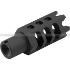 Дульный тормоз-компенсатор Корона 3 для моделей страйкбольного оружия. ДТК изготовлен под отрицательную (левую) резьбу 14*1-. Устанавливается на большинство моделей приводов без каких-либо переходников, но иногда может требовать применение фум ленты или уплотнителя. Корпус ДТК изготовлен из стали, покрытие – воронение.