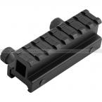 Повышающая планка с креплением на RIS/RAS для установки оптический, коллиматорных и других прицелов или навесного оборудования. При этом в планке есть сквозное отверстие для возможности прицеливания через стандартные приспособления (мушка, целик). Высота (величина повышения) – 25 мм. Общая длина планки – 85 мм. Материал – сплав алюминия.