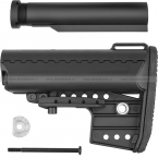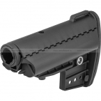 Шестипозиционный телескопический приклад из прочного пластика. Предназначен для установки на стандартные 30 мм трубы страйкбольного оружия. За съемным тыльником приклада располагаются 2 вместительных отделения для размещения аккумулятора. На корпусе приклада есть крепления для QD-антабки.