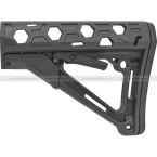 Пластиковый телескопический приклад, выполненный в стиле прикладов CTR с вырезами в виде шестигранников (HEX). Подходит для моделей страйкбольного оружия, оснащенных стандартной 30 мм трубой. Корпус приклада выполнен из пластика. Есть гнездо для установки быстросъемной (QD) антабки.
