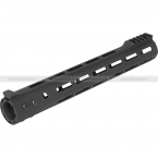 Прочное и стильное алюминиевое цевье для страйкбольного оружия М4-серии и другие модели, построенные на базе этой платформы. Тип цевья – free-float. Основной интерфейс – M-LOK, но сверху есть две секции к 20 мм рельсой (RIS). Слева и справа на корпусе цевья есть гнезда под QD-антабку.