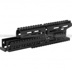 Тактическое цевье для страйкбольных автоматов серии АК (модели CYMA CM040 и аналоги). Цевье изготовлено из алюминиевого сплава. По верхней и нижней грани идут 20 мм планки (RIS), по бокам идут крепления интерфейса KeyMod, на которые предустановлены RIS планки. На планки можно закрепить большое количество навесного оборудования, например, подствольный гранатомет, ЛЦУ, фонарь, тактическую рукоять и др.