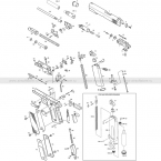 Запчасти для модели страйкбольного пистолета KJW Colt M1911A1 (грингаз и CO2). В таблице приведены номера деталей и их названия. На иллюстрациях показана взрыв-схема.